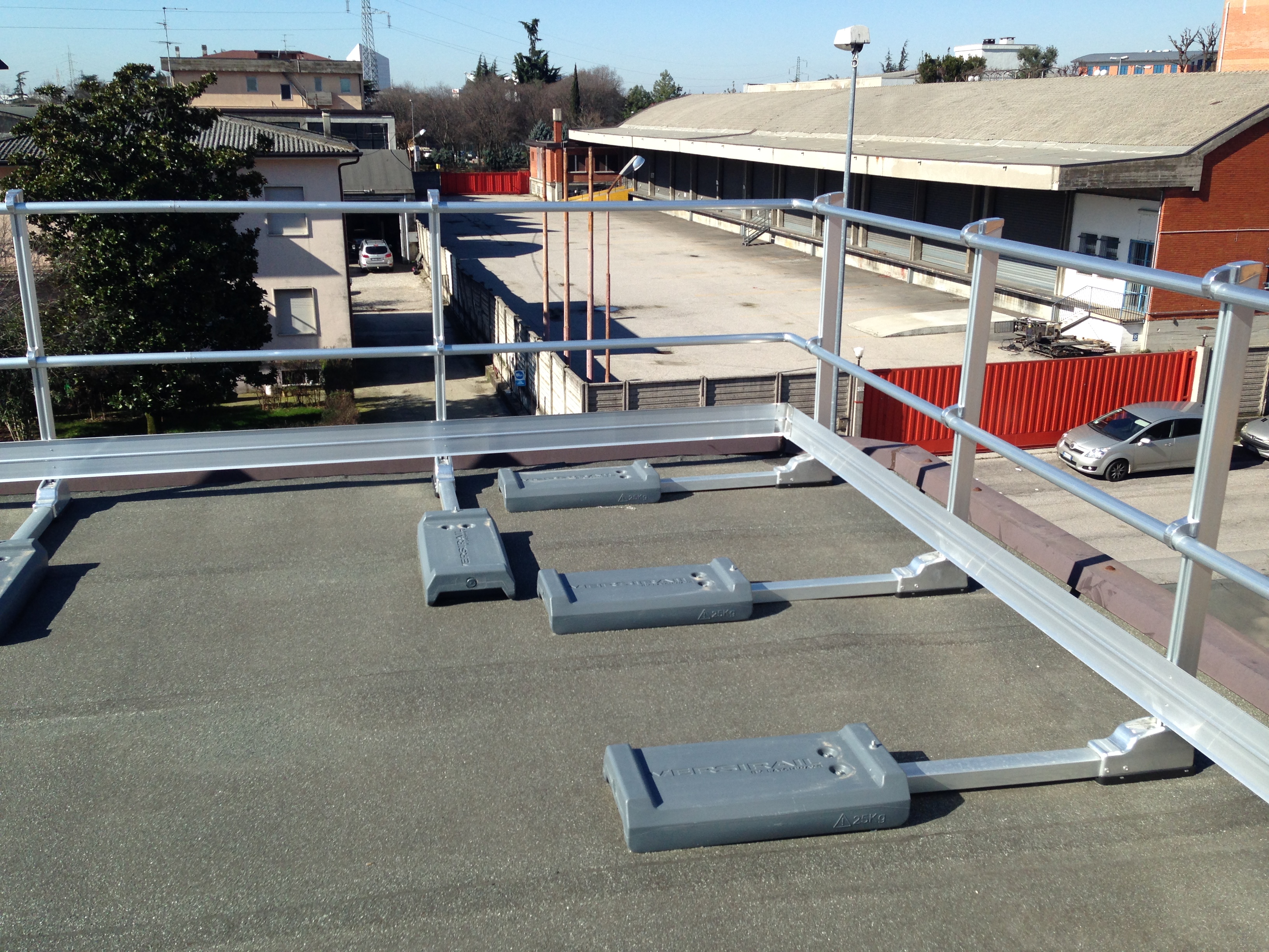 Fornitura e posa di una linea di parapetti a zavorra e di una linea vita permanente. Il tutto per la messa in sicurezza della copertura da noi realizzata.