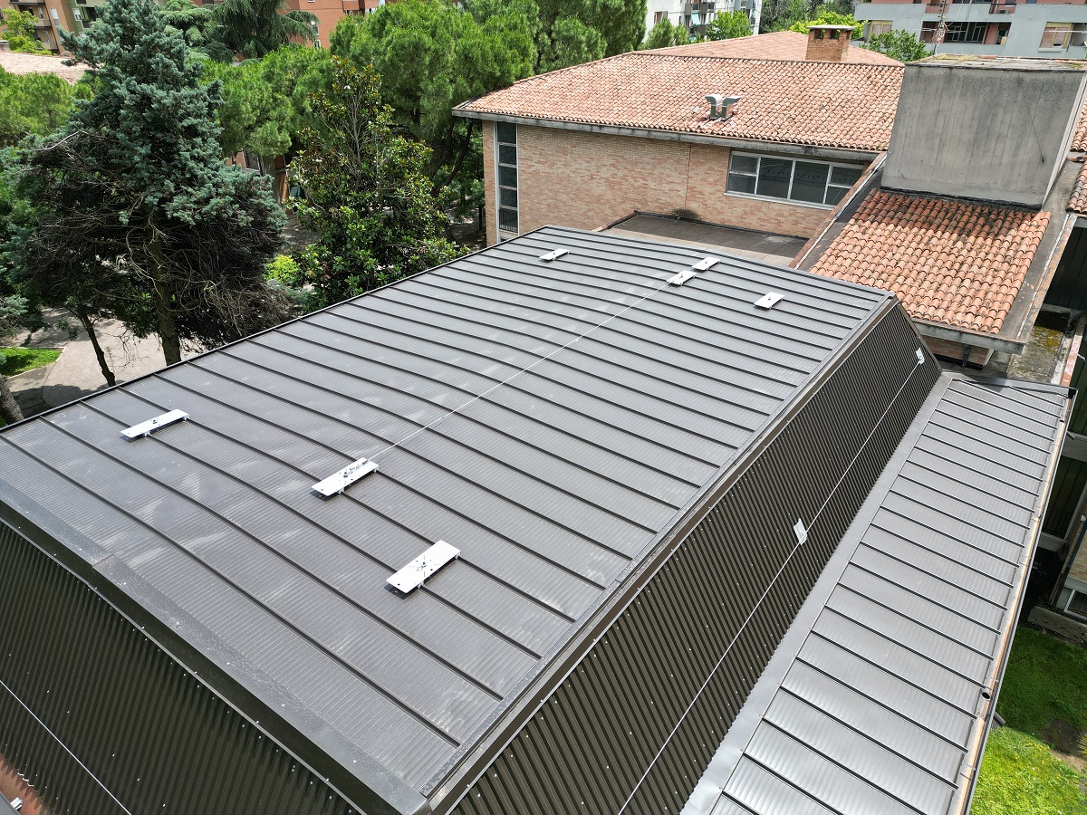 Inoltre abbiamo installato dei sistemi di sicurezza permanenti per l’accesso e lo stazionamento in copertura.