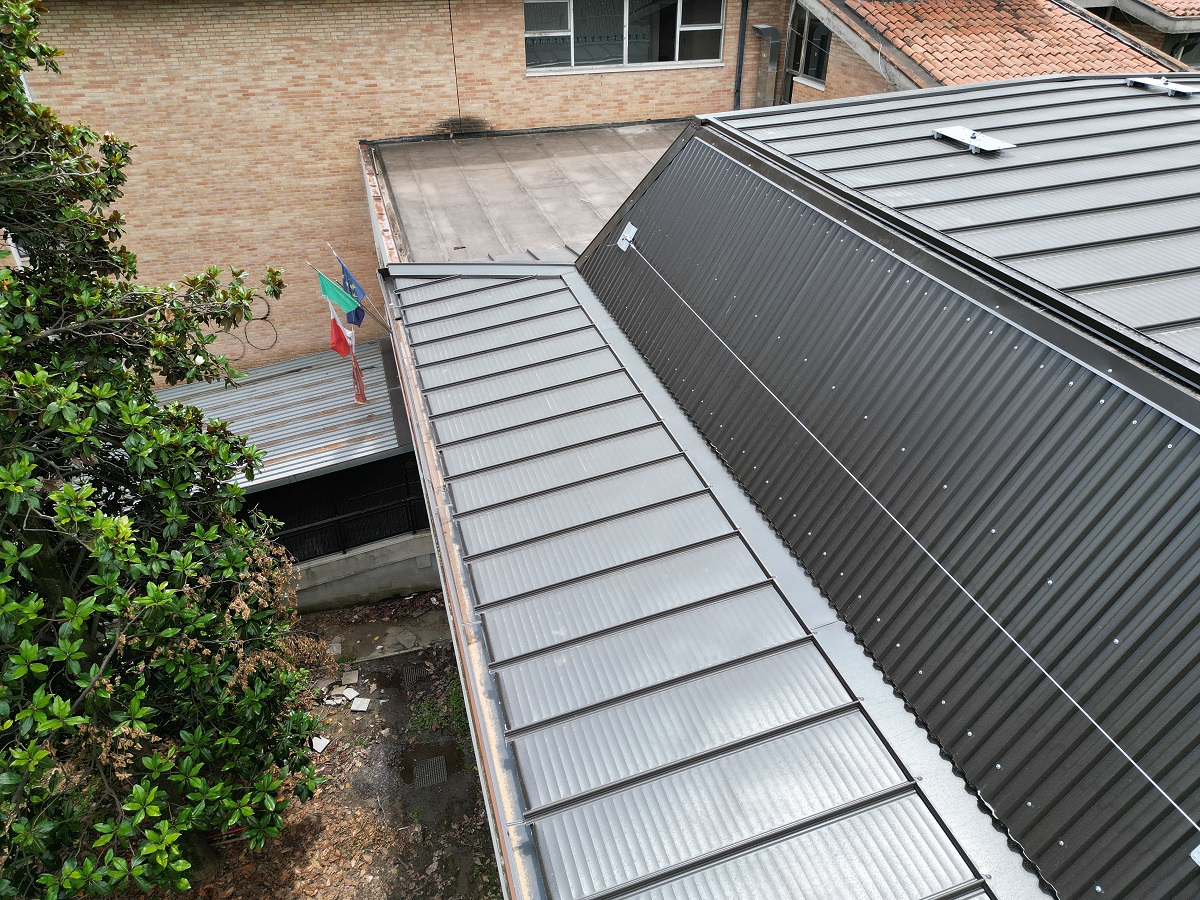 Sono terminati i lavori di realizzazione di una nuova copertura mista con elementi a giunti drenanti e lastre grecate in alluminio preverniciato della scuola “Aldo Fedeli” a Verona.