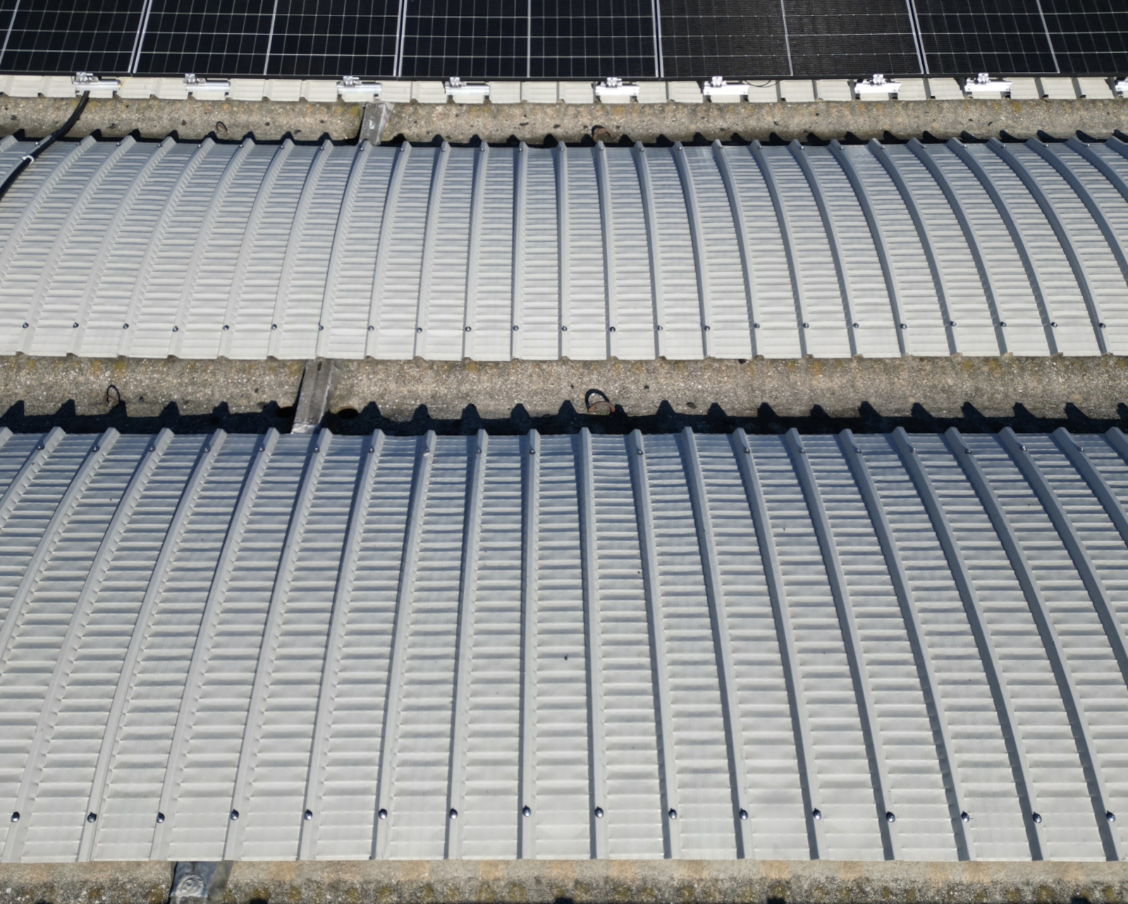 In particolare, gli operatori di Fenice Coperture hanno rimosso la lamiera metallica superiore, l’eternit inferiore e la lana isolante. Successivamente, hanno realizzato il rifacimento della copertura mediante posa di lastre grecate in lamiera curva avente spessore 6/10 di acciaio zincato e preverniciato.