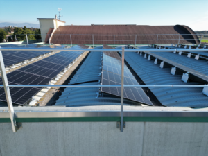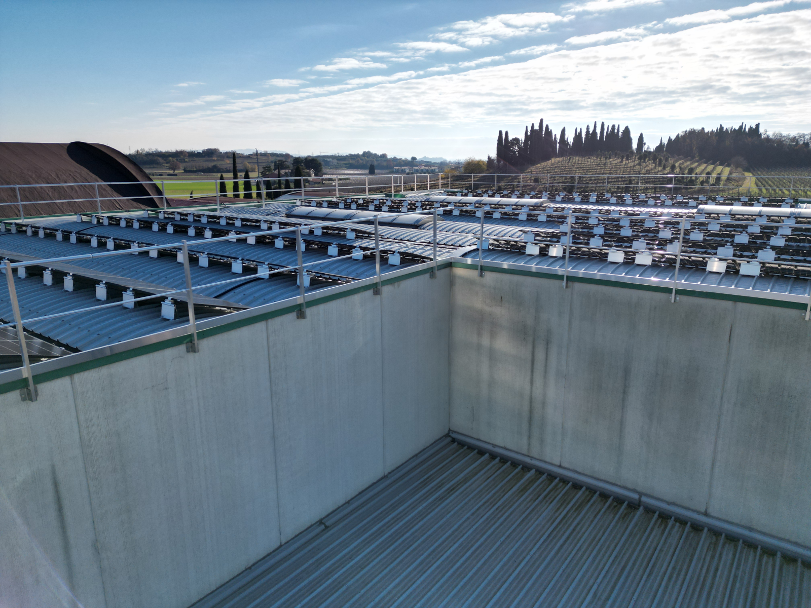 Per garantire l’accesso e lo stazionamento in copertura in totale sicurezza – necessario sia per le future manutenzioni della copertura, sia per la presenza dell’impianto fotovoltaico – sono stati fissati parapetti perimetrali SICURGUARD, prodotti da Sial Safety S.r.l., nostro partner di fiducia.